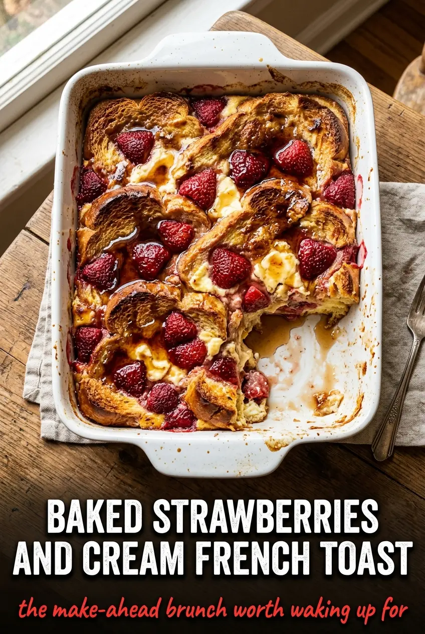 Golden-brown baked French toast with strawberries and cream has that rare brunch magic where the top stays lightly crisp, the center turns custardy, and every bite tastes like it came from extra effort even though the oven does most of the work. The bread soaks up the vanilla-scented custard as it bakes, so you get soft, rich slices instead of a soggy casserole or dry edges.