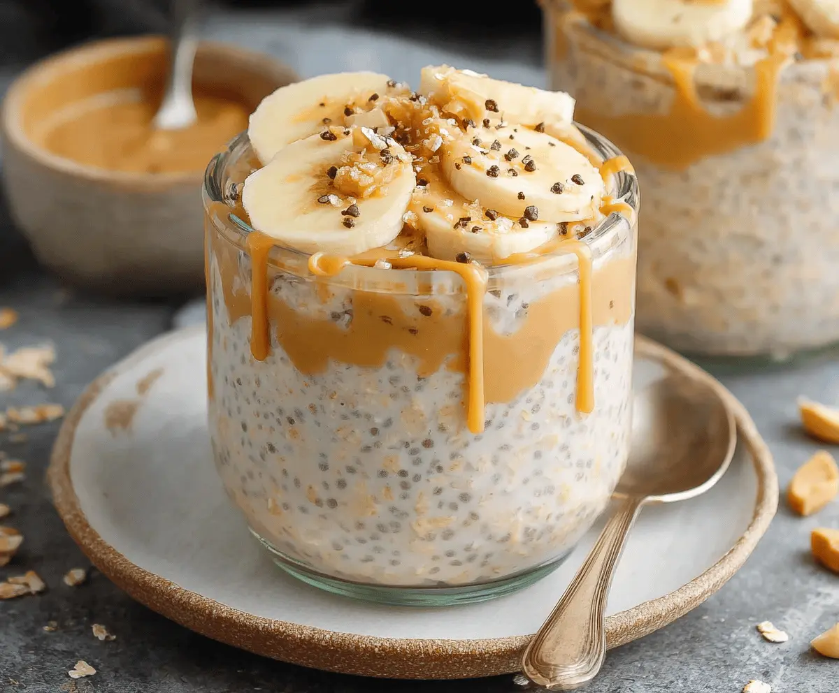 Creamy Banana Peanut Butter Overnight Oats in a glass jar topped with sliced bananas and peanut butter.