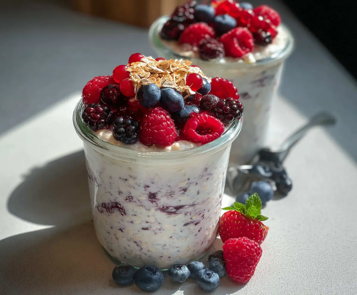 Start your day with these yummy berries and cream overnight oats! They’re filled with fresh berries, creamy yogurt, and rolled oats, making breakfast feel special every morning.