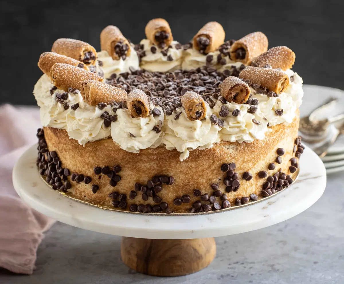 Now for the fun part! Press mini chocolate chips around the bottom edge of the cake and on the sides if desired. Using a piping bag fitted with a star tip, pipe decorative swirls along the edge of the top of the cake. If you’d like, fill mini cannoli shells with cannoli cream and arrange them on top of the swirls. Sprinkle some mini chocolate chips over the center of the cake for that extra treat! Optionally, drizzle caramel or chocolate sauce over the sides of the cake for a beautiful look. Lastly, lightly dust the entire cake with powdered sugar.