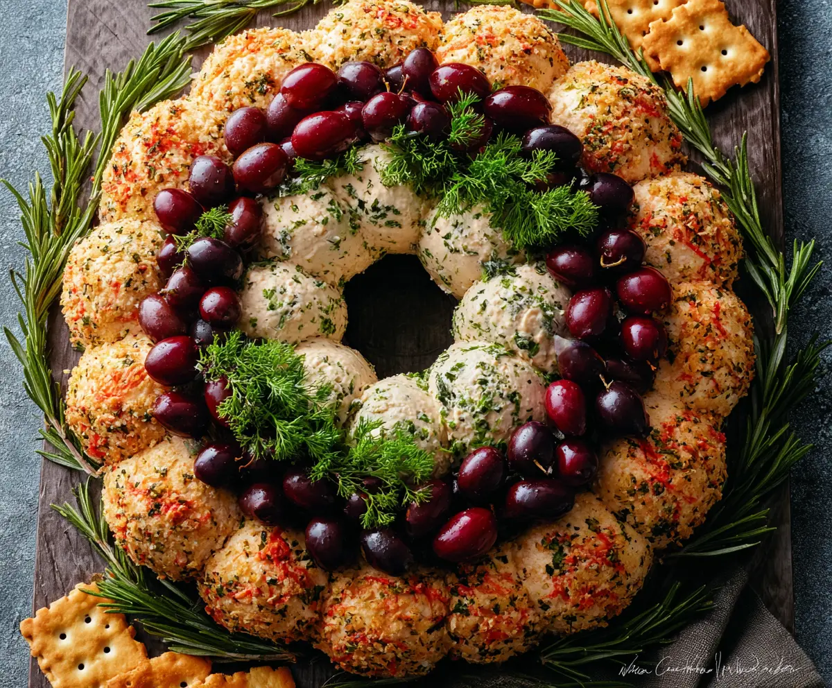 Delicious cheeseball wreath garnished with herbs, perfect for appetizer parties.