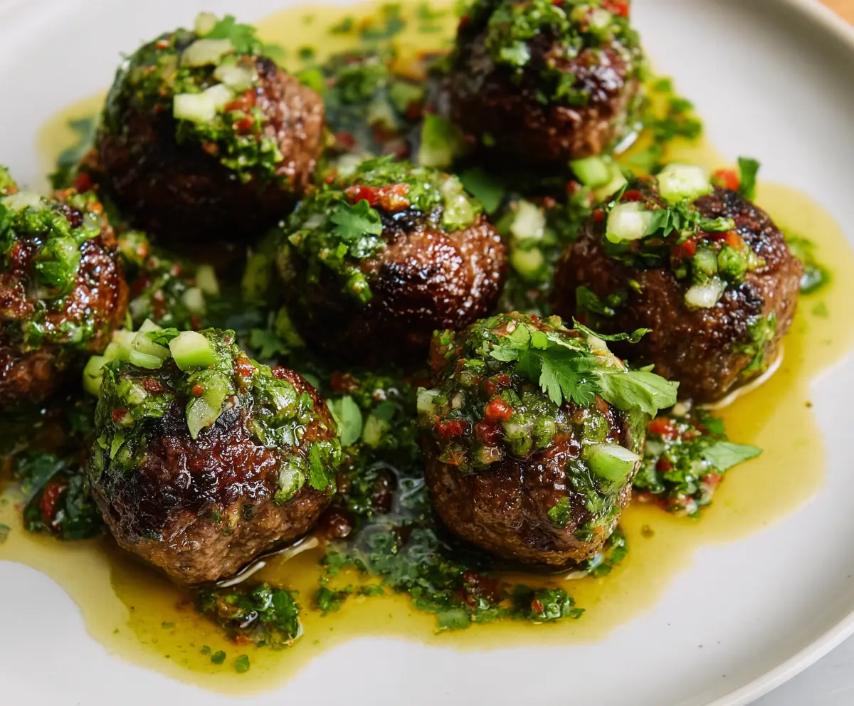Transfer the meatballs to a serving plate and spoon the chimichurri sauce generously over the top. If you like, garnish with extra chopped parsley for a fresh touch.