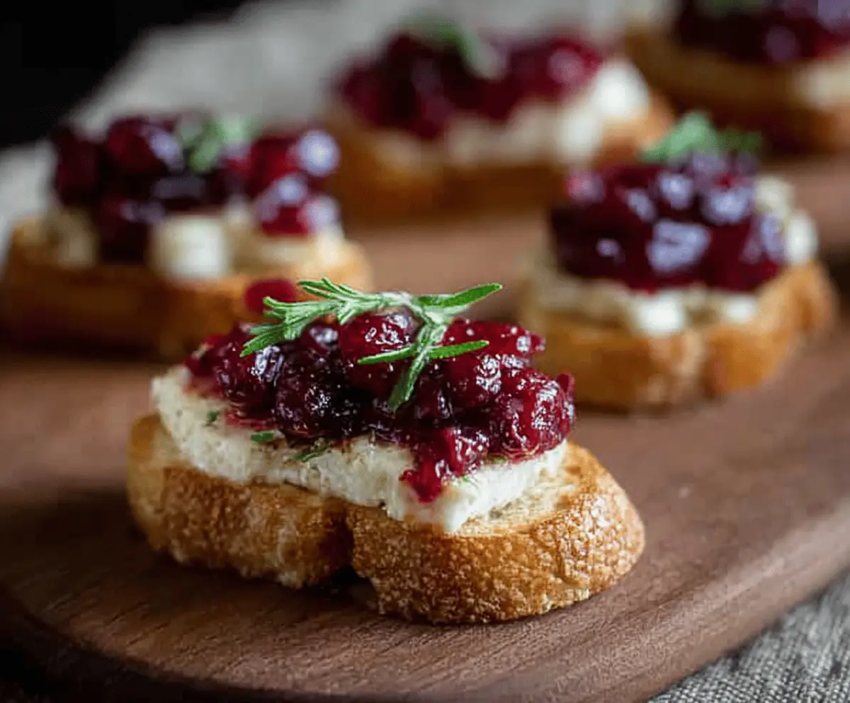 You can prepare the cranberry sauce ahead of time and store it in the fridge for up to a week. To save time on the day of serving, toast the bread and assemble the toasts up to an hour ahead, then warm them in the oven right before serving.