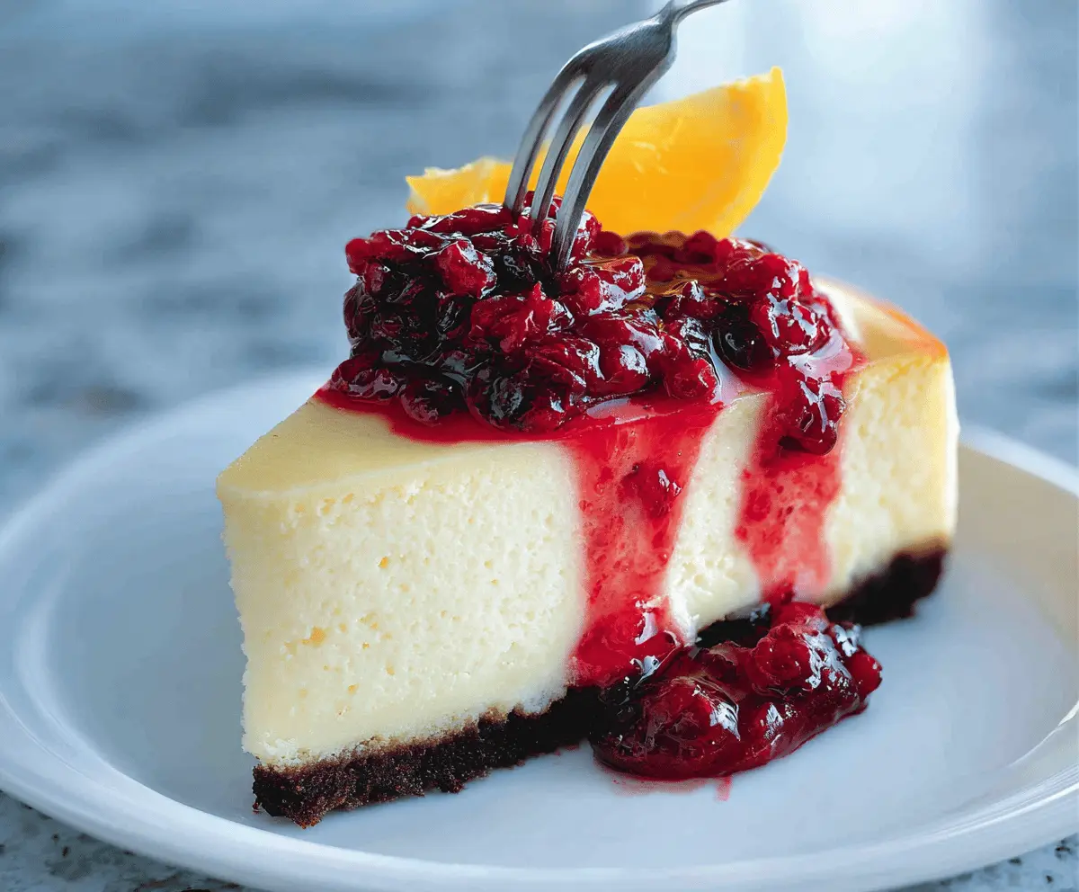 Once the cheesecake is fully chilled and the topping has cooled, spread the cranberry topping evenly over the cheesecake. Decorate with fresh orange slices or twists for that beautiful final touch.