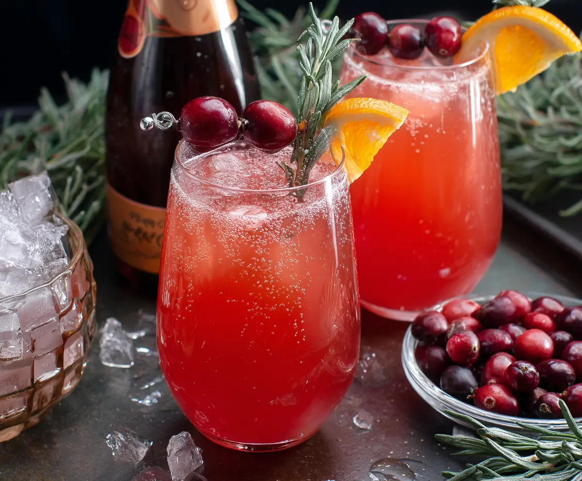 For a festive touch, garnish each drink with fresh cranberries on a cocktail pick and a sprig of rosemary. The colors are beautiful and they add additional flavors.