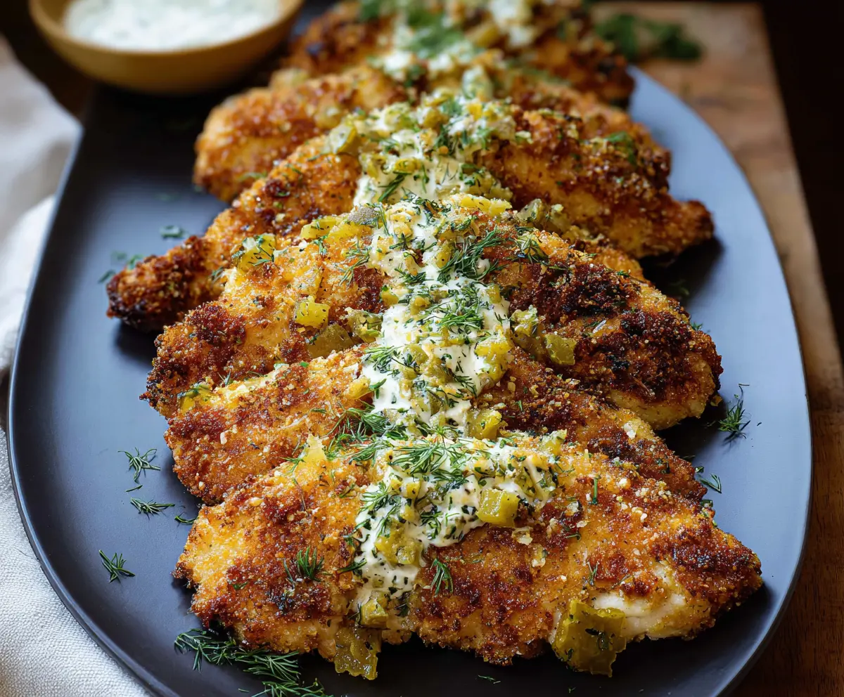 Place your crispy chicken on a serving plate. Generously spoon the dill pickle parmesan sauce over the chicken. Don’t forget to garnish with the thinly sliced or chopped dill pickles and fresh dill sprigs for that extra touch!