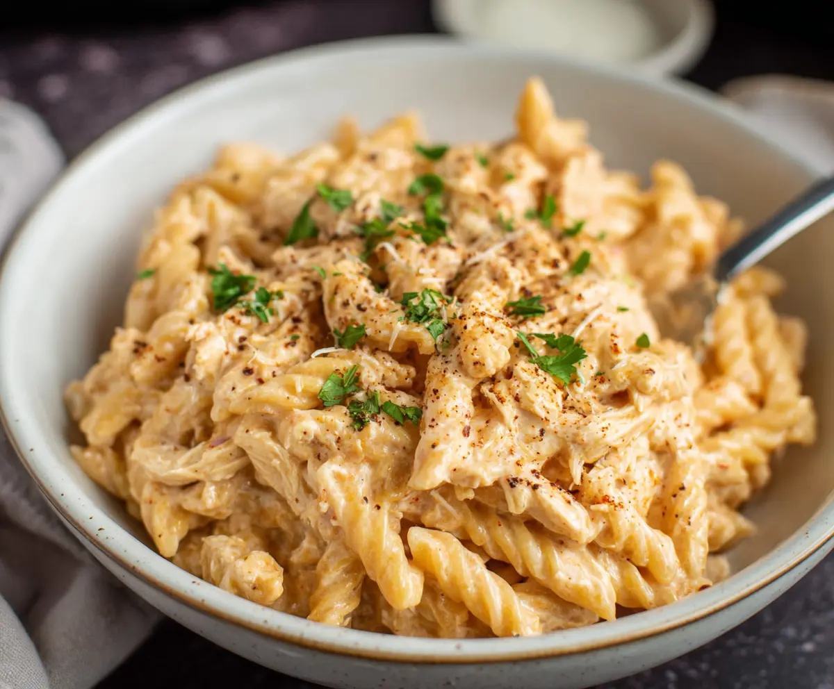 Delicious crockpot chicken pasta served in a bowl with herbs and cheese