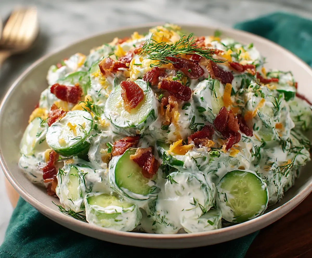 Carefully transfer your cucumber mixture to a serving bowl. On top of the salad, sprinkle the crumbled crispy bacon, shredded cheddar cheese, and fried onions. These add lovely textures and flavors that take your salad to the next level!