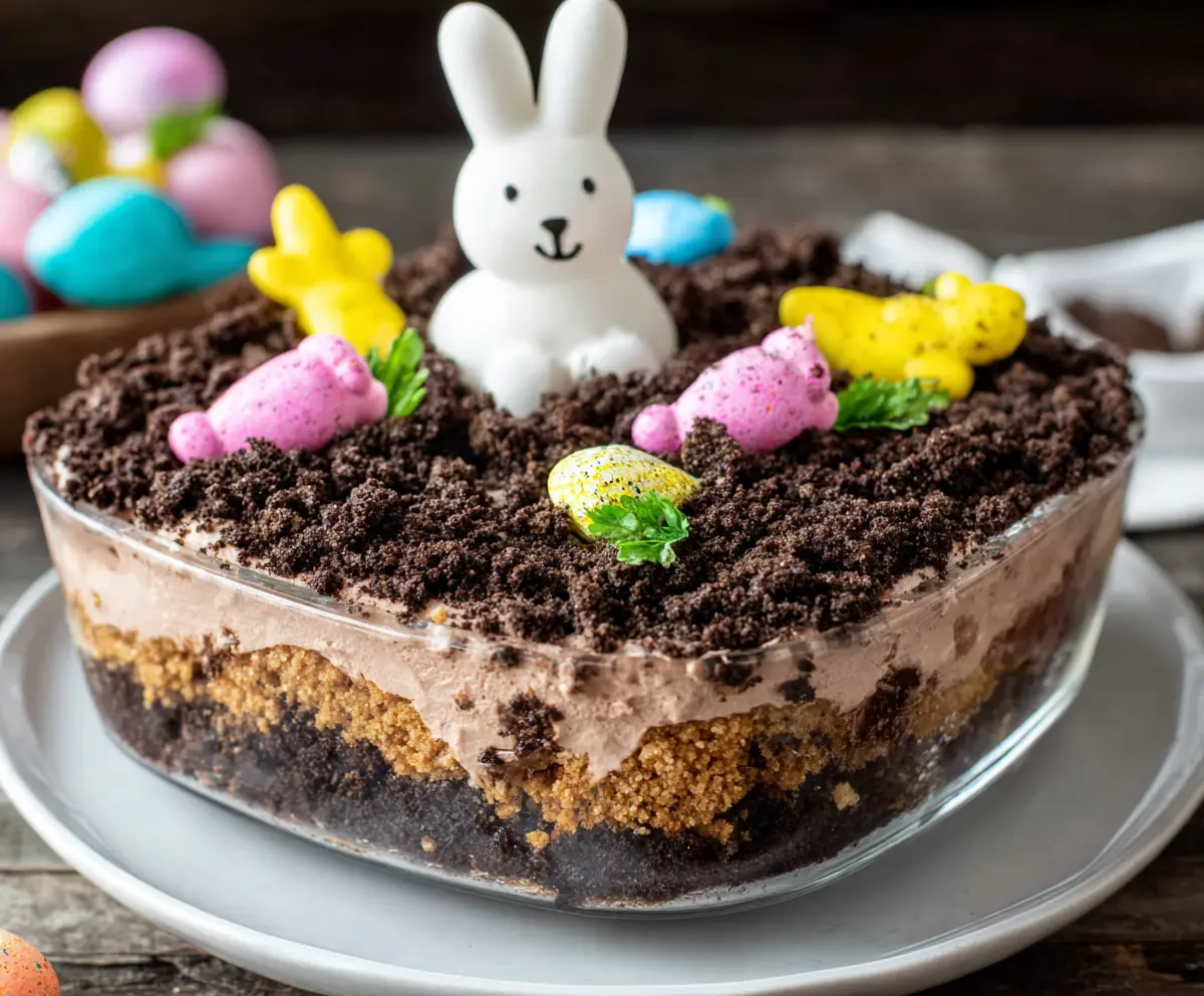 Finally, cover the assembled cake and refrigerate it for at least 2 hours to let it set. Serve it chilled and watch everyone enjoy this festive and sweet “dirt” dessert that’s perfect for Easter celebrations!