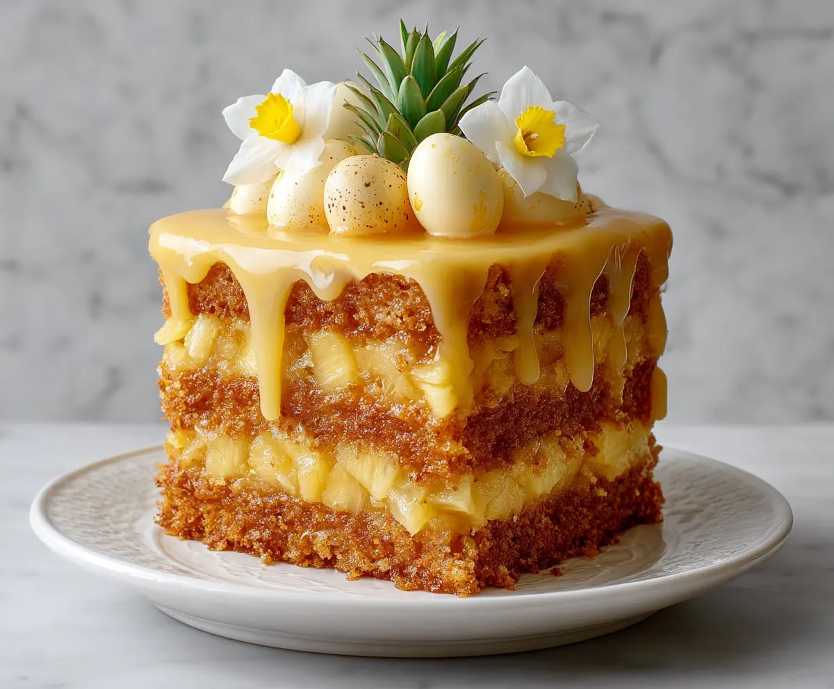 Now for the fun part! Top your cake with fresh pineapple chunks, and arrange edible flowers artfully around the top. Sprinkle on any decorative Easter candies or shaped pineapple decorations you’d like for that festive touch!