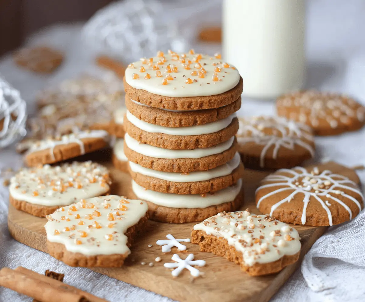 Delicious Eggnog Iced Gingerbread Cookies decorated with festive icing, perfect for holiday treats.