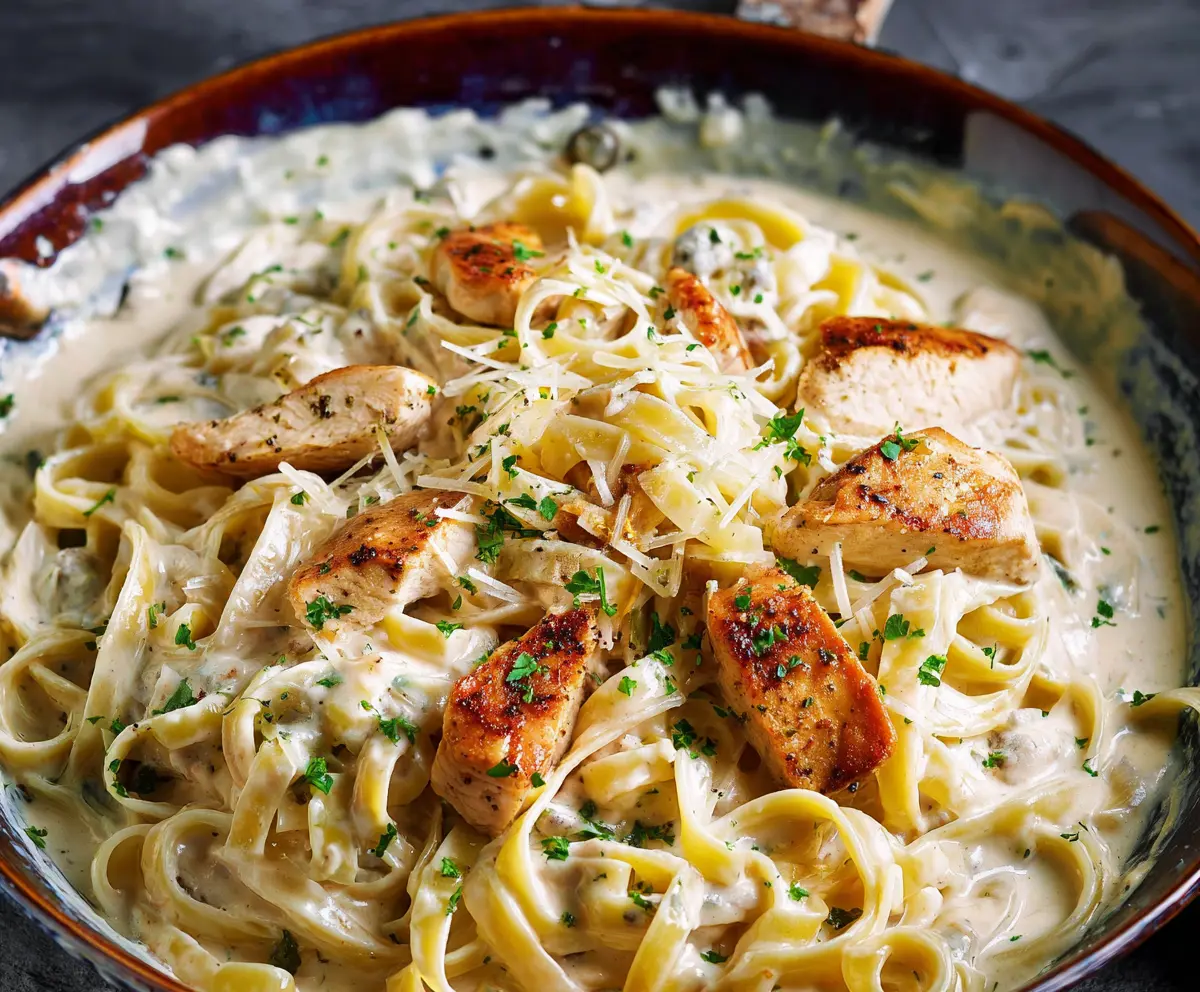 This creamy Fettuccine Alfredo with chicken is a cozy dish that warms your heart! The pasta is covered in a rich and cheesy sauce, making each bite a hug for your taste buds.