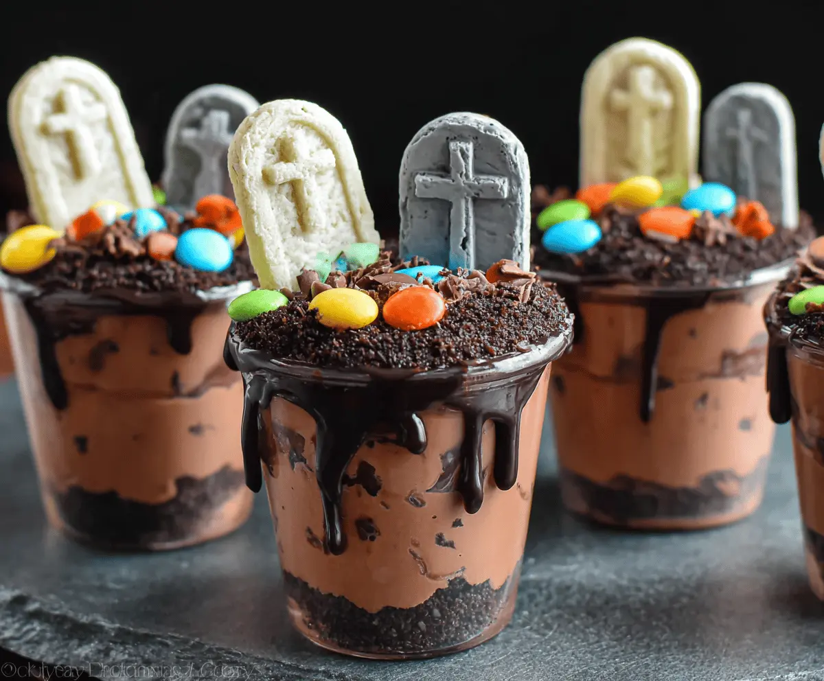 These Graveyard Chocolate Pudding Cups are spooky fun! They’re made with rich chocolate pudding, crushed cookies for dirt, and gummy worms peeking out. Perfect for Halloween!