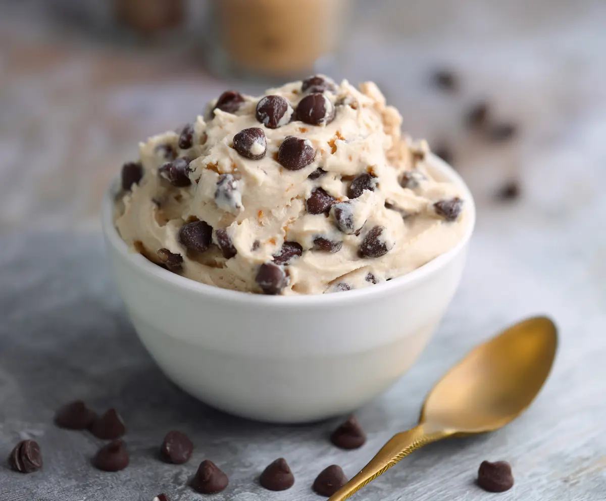 Healthy Greek yogurt protein cookie dough served in a bowl, perfect for a nutritious snack.