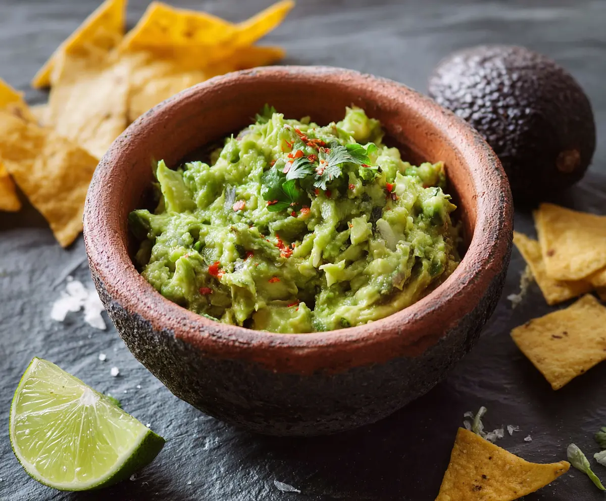 Guacamole is a creamy and tasty dip made mostly from ripe avocados, lime juice, and a sprinkle of salt. It’s perfect for scooping up with chips or adding to tacos!