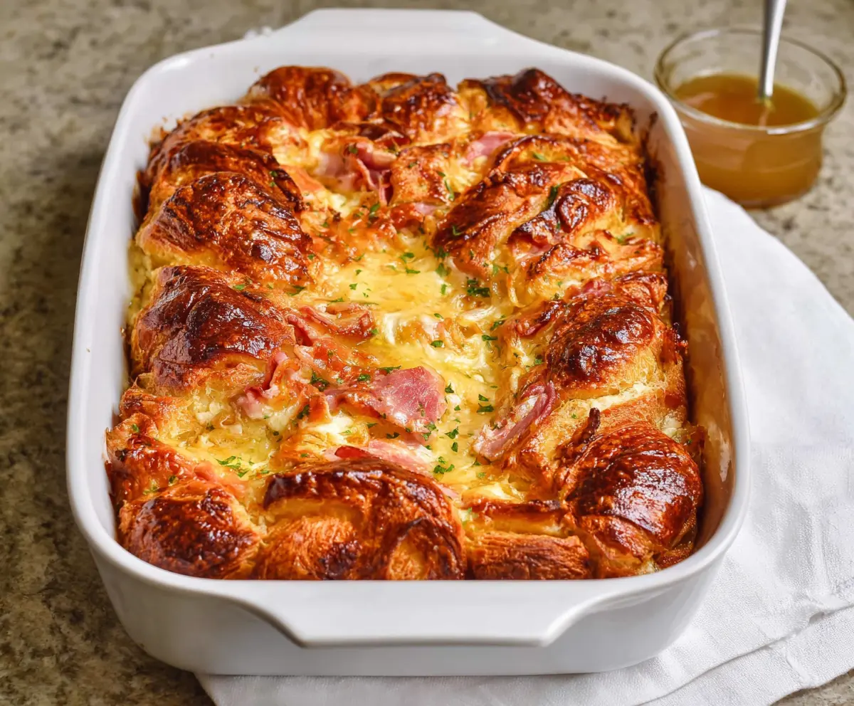 Serve this warm, cheesy, ham-filled croissant bake at your next brunch or breakfast gathering, and enjoy every delicious bite!