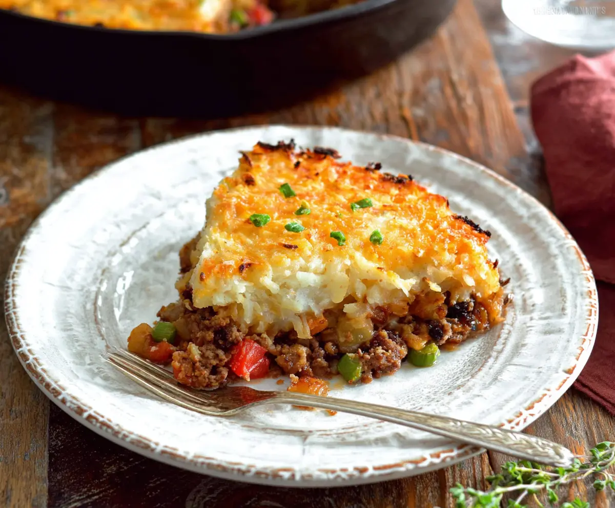 This Hash Brown Shepherd’s Pie is a cozy dish that layers seasoned ground meat with veggies, all topped with crispy hash browns. It’s easy to make and absolutely comforting!