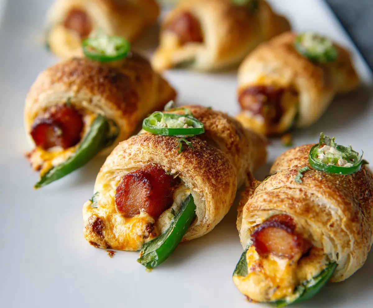 These Jalapeño Popper Pigs In A Blanket are a fun twist on a classic snack! Juicy sausages wrapped in flaky dough and packed with cheesy, spicy goodness will make your taste buds dance.
