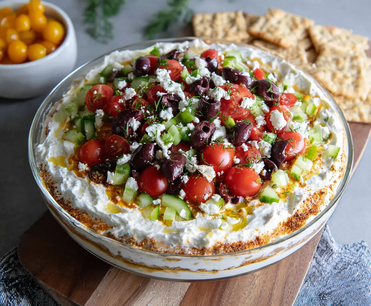 Once chilled, serve your vibrant Greek Dip with whole grain crackers or pita chips. Enjoy every delicious bite with friends and family!