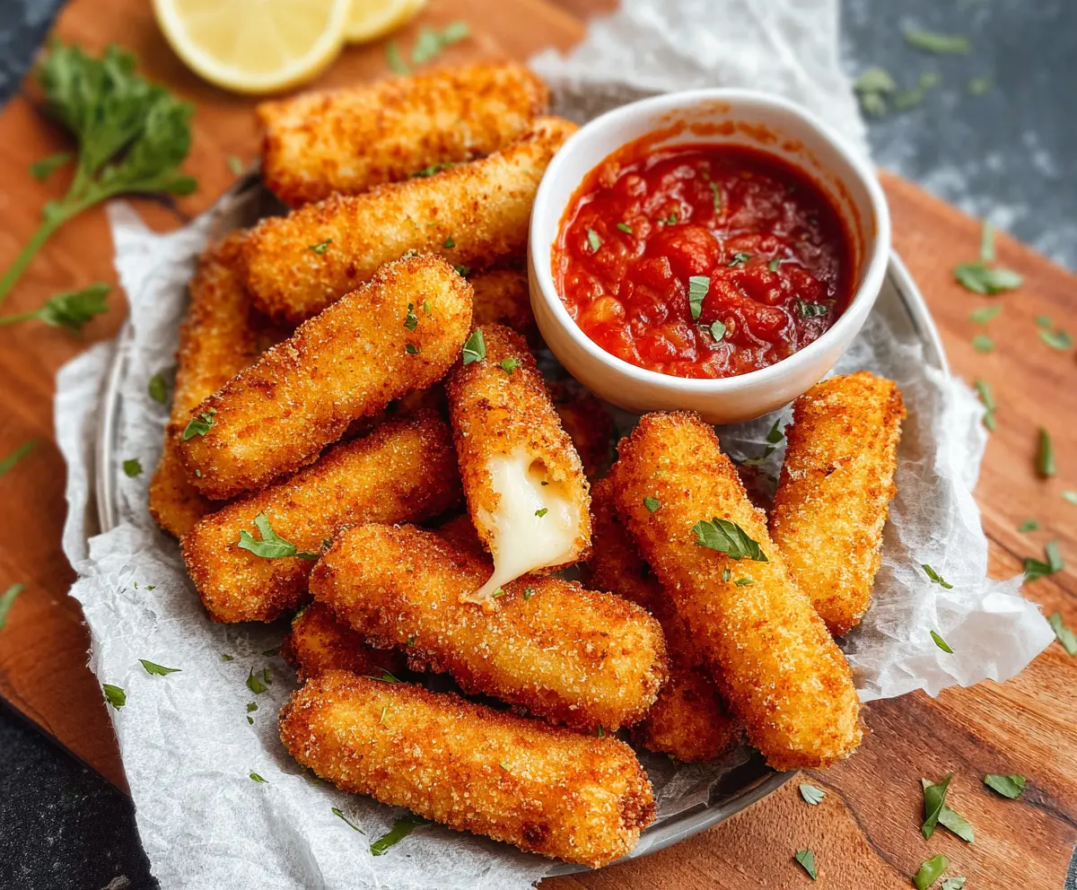 These cheesy mozzarella sticks are a fun snack that everyone loves! They are crispy on the outside and gooey on the inside, making them super tasty for dipping in marinara sauce.