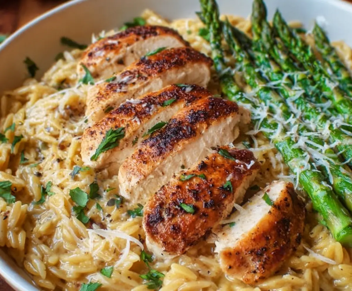 Serve warm and enjoy this delicious, comforting dish that balances creamy orzo with tender chicken and fresh asparagus!
