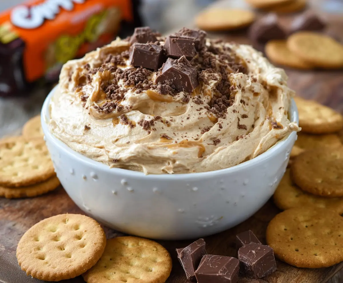 Transfer your dip to a serving bowl and sprinkle the chopped chocolate-covered peanut butter candy pieces on top for a sweet finish. It looks delicious and inviting!