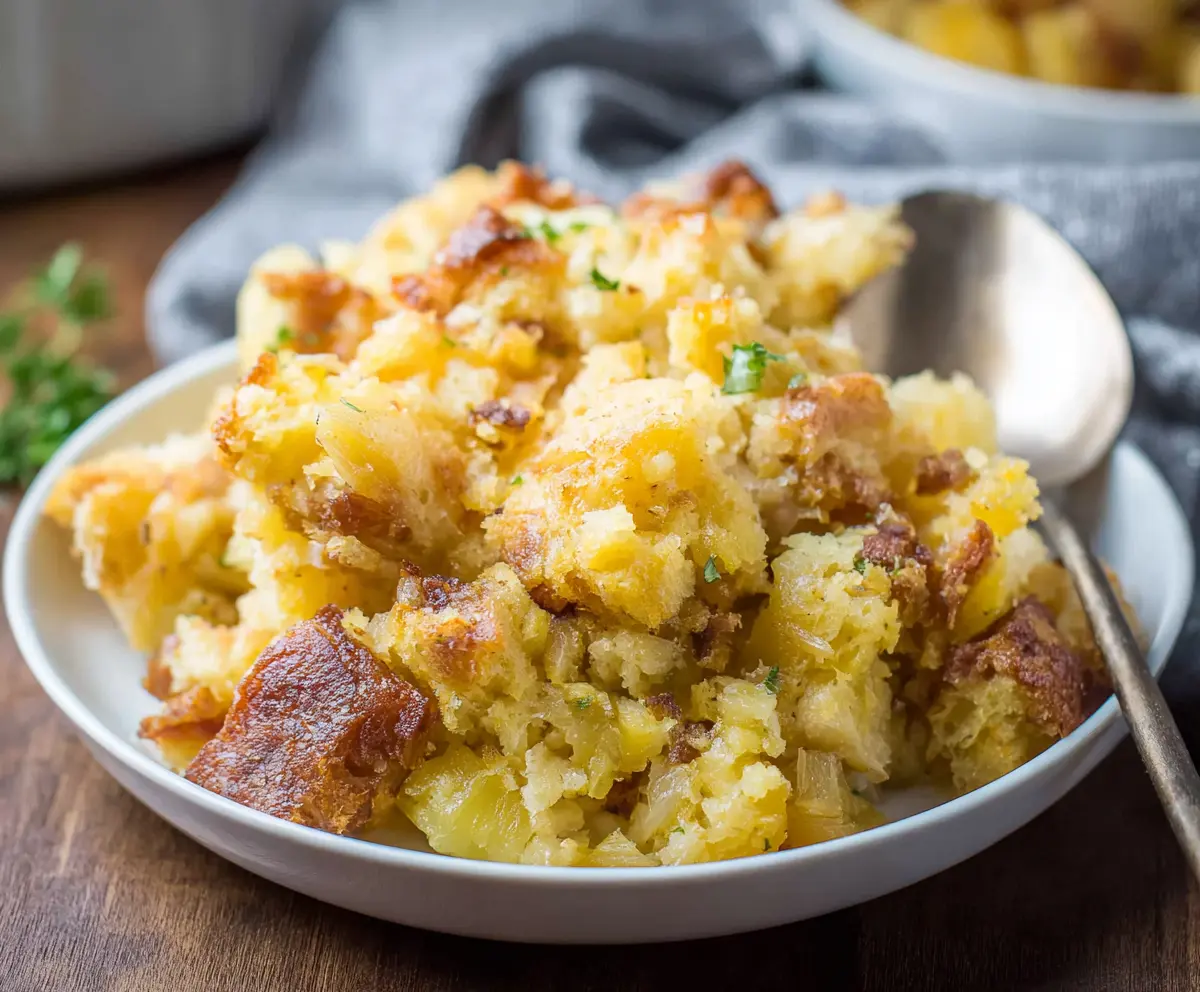 Pineapple stuffing is a sweet and tangy side dish that’s sure to brighten up your meal. Made with fluffy bread, juicy pineapple, and a touch of sugar, it’s super easy to whip up.