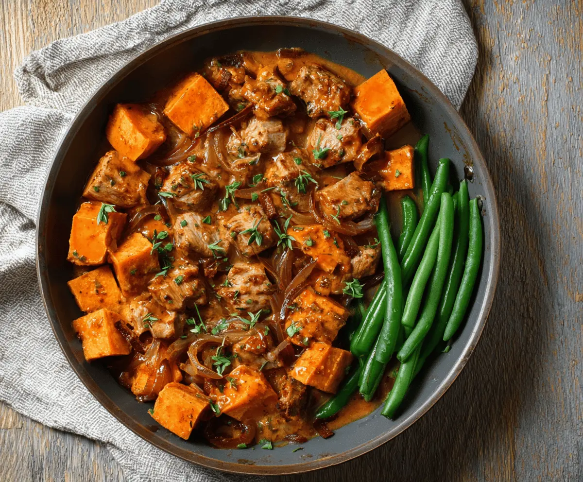 Delicious pork and sweet potato skillet with colorful vegetables, served hot in a skillet for a hearty and healthy meal.