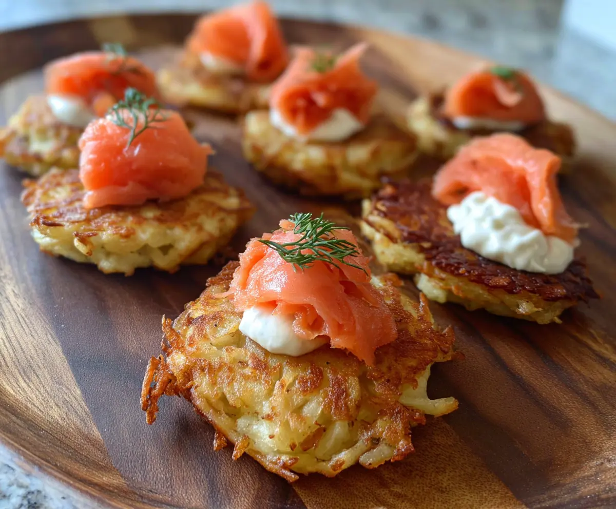 These crispy potato latke bites topped with smoked salmon are a fun twist on a classic dish! They are golden, crunchy, and bursting with flavor—perfect for parties or a tasty snack.