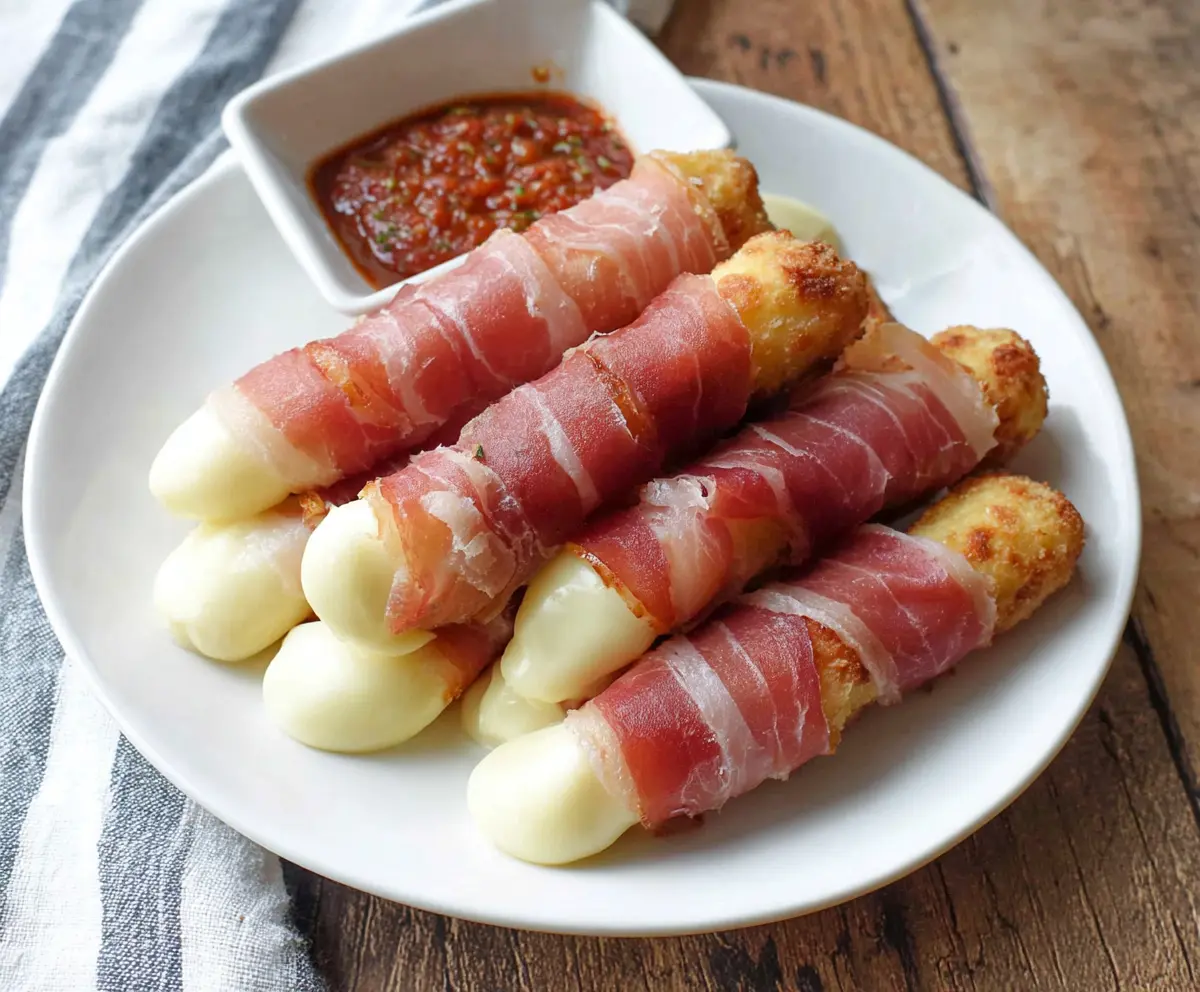 These prosciutto-wrapped mozzarella sticks are a fun twist on a classic snack! The creamy cheese and salty prosciutto create the perfect pair.