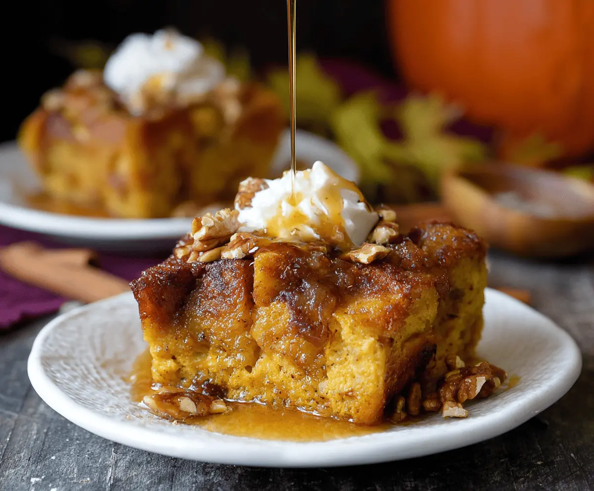 Delicious pumpkin bread pudding topped with whipped cream and caramel drizzle, perfect for fall desserts