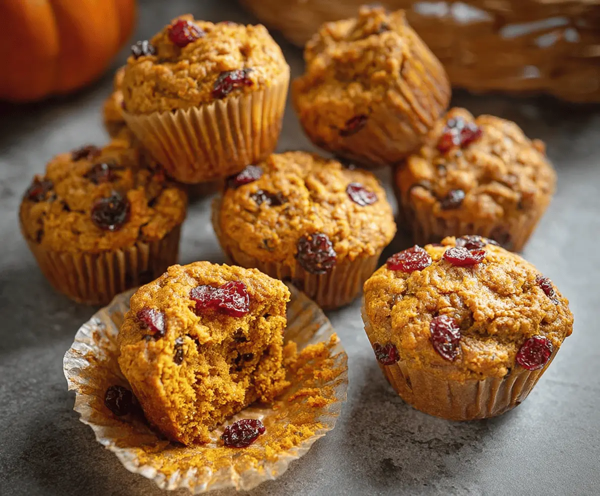 Delicious homemade pumpkin cranberry muffins with a golden-brown crust and vibrant red cranberries, perfect for fall breakfast or snacks.