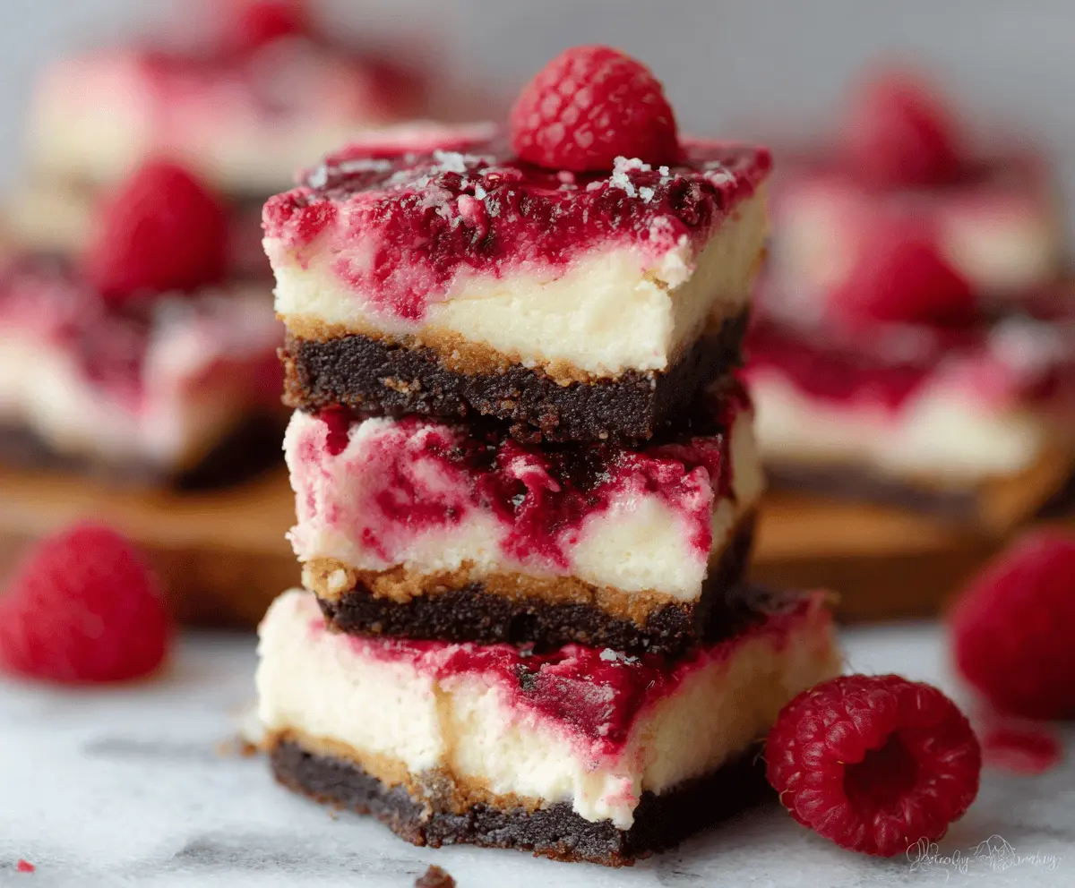 These Raspberry Cheesecake Bars have a rich chocolate crust, creamy cheesecake center, and a vibrant raspberry swirl on top — a perfect balance of sweet, tart, and luscious textures! Enjoy!