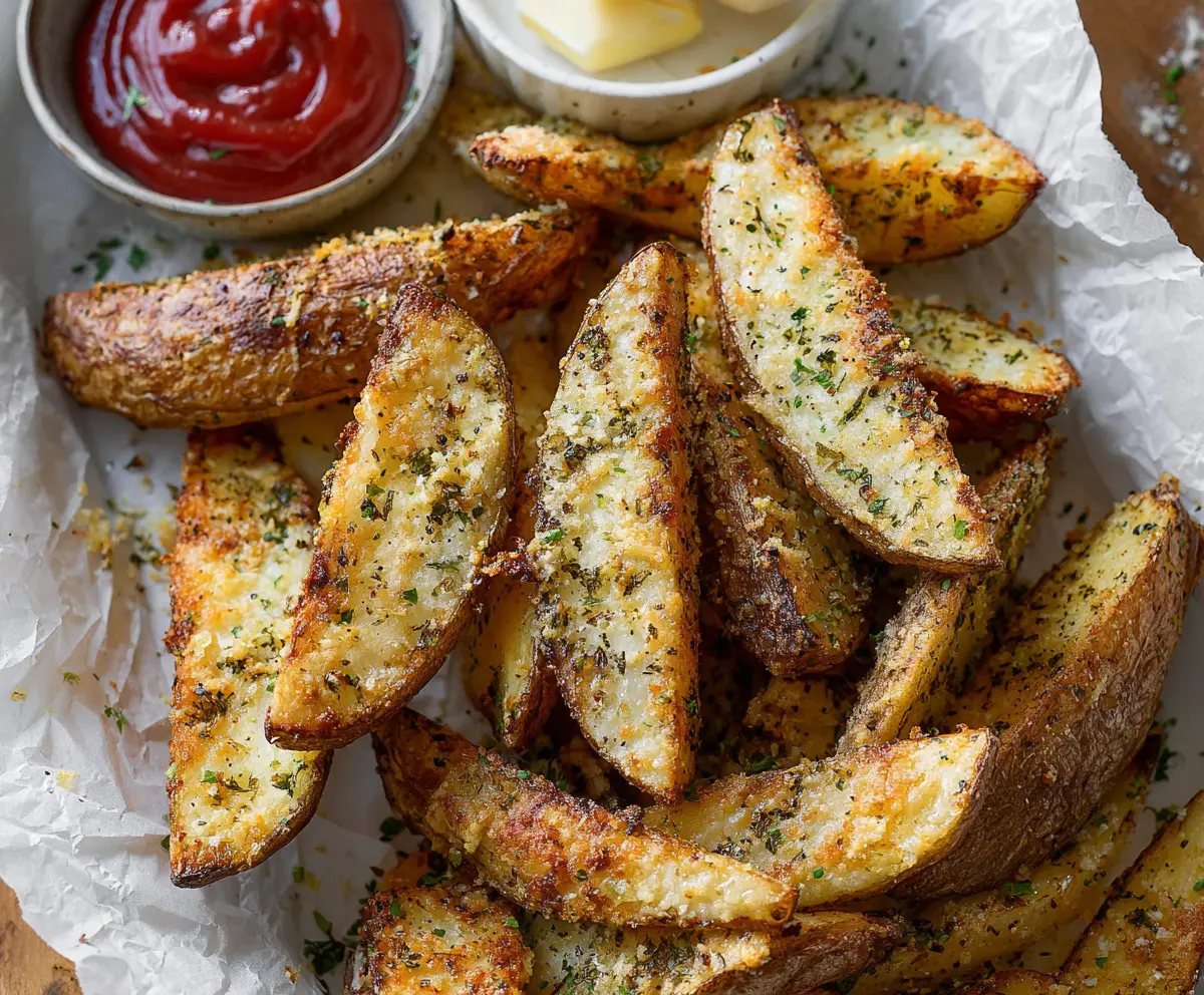 Enjoy your crispy, garlicky, cheesy potato wedges as a fantastic appetizer or side dish!