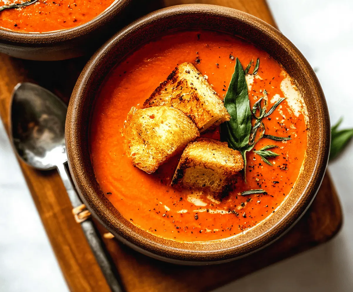 This roasted tomato soup is rich, vibrant, and perfectly balanced, showcasing the delightful sweetness of roasted tomatoes alongside aromatic herbs and garlic. The crunchy bread or croutons add an enjoyable texture, making it a perfect dish to warm you up on chilly days. Bon appétit!
