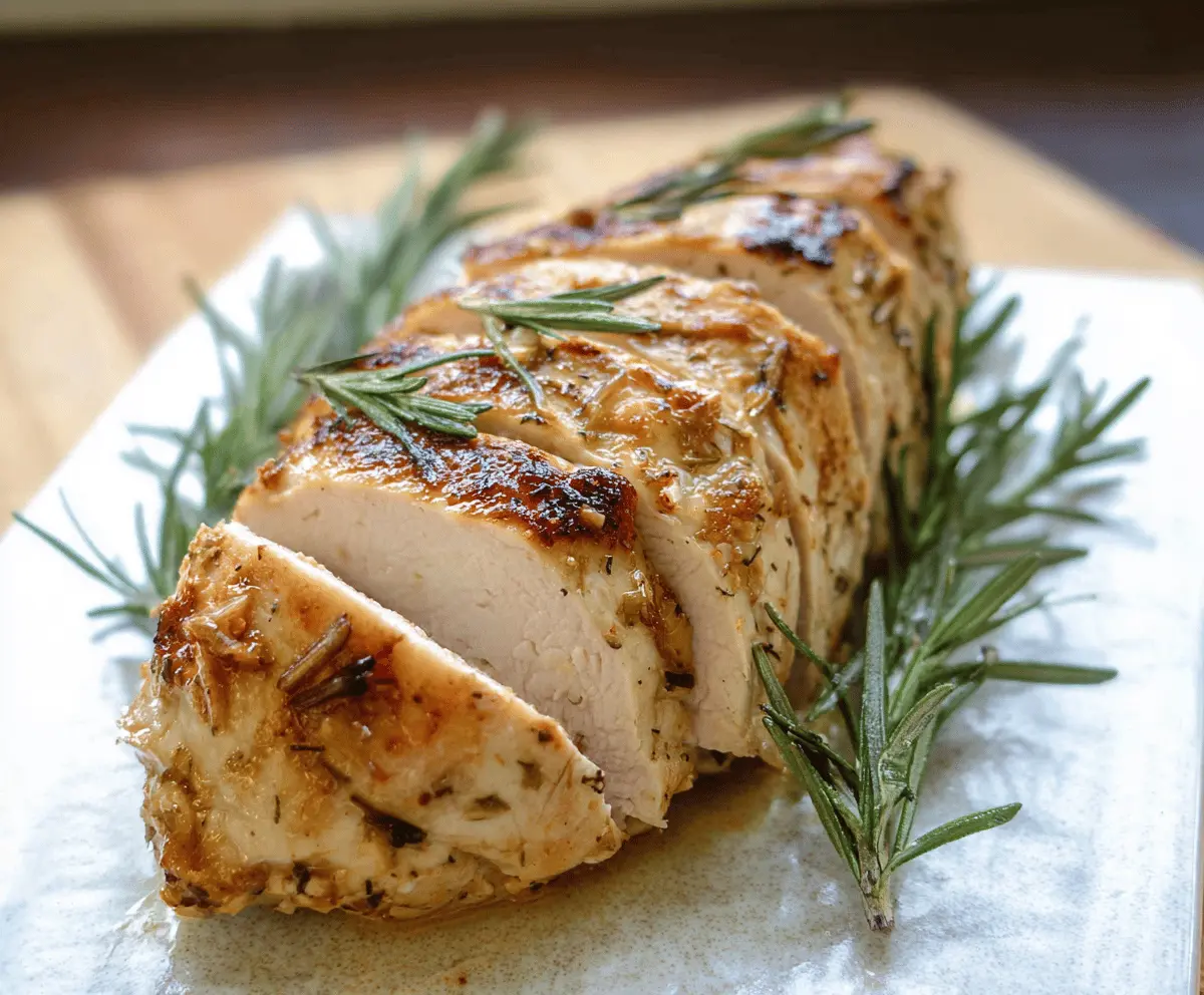 After resting, slice the turkey breast into pieces and garnish with fresh rosemary sprigs. Serve warm and enjoy this delightful dish with your favorite sides!