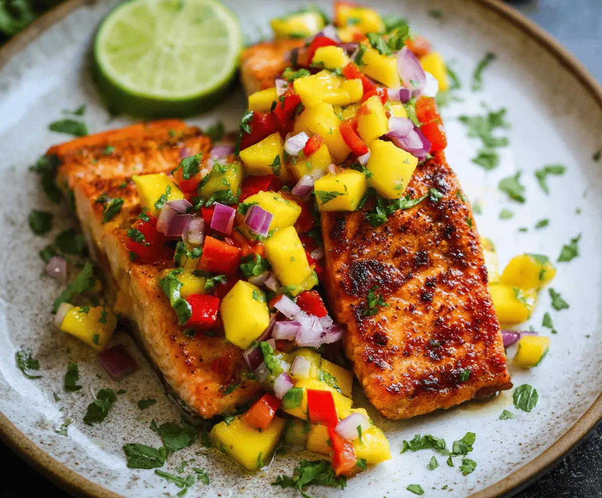 At this stage, your salmon should be ready to go! Place the salmon fillets on plates and spoon the zesty mango salsa generously over the top. Don’t forget to add lime wedges on the side for an extra pop of flavor. Enjoy this colorful and flavorful dish, where the sweet and tangy mango salsa perfectly complements the smoky, seasoned salmon!