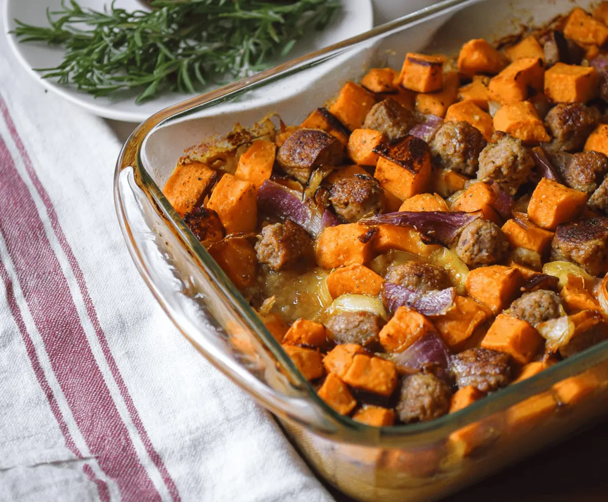 Delicious sausage and sweet potato casserole in a baking dish, perfect for a hearty meal.