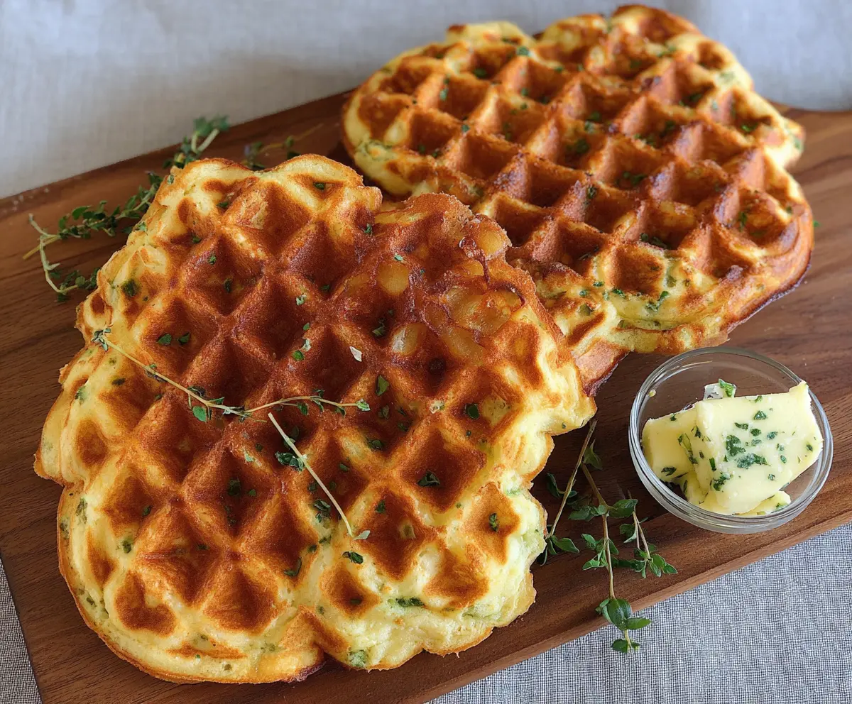 Carefully remove the waffles from the iron. For an extra special touch, top each waffle with a pat of herbed butter—just mix some finely chopped herbs into soft butter before serving. Yum!