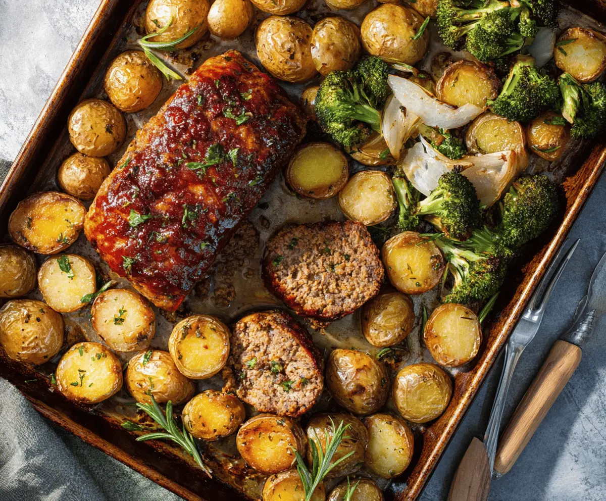 Delicious sheet pan meatloaf with roasted potatoes and vegetables, ready to serve