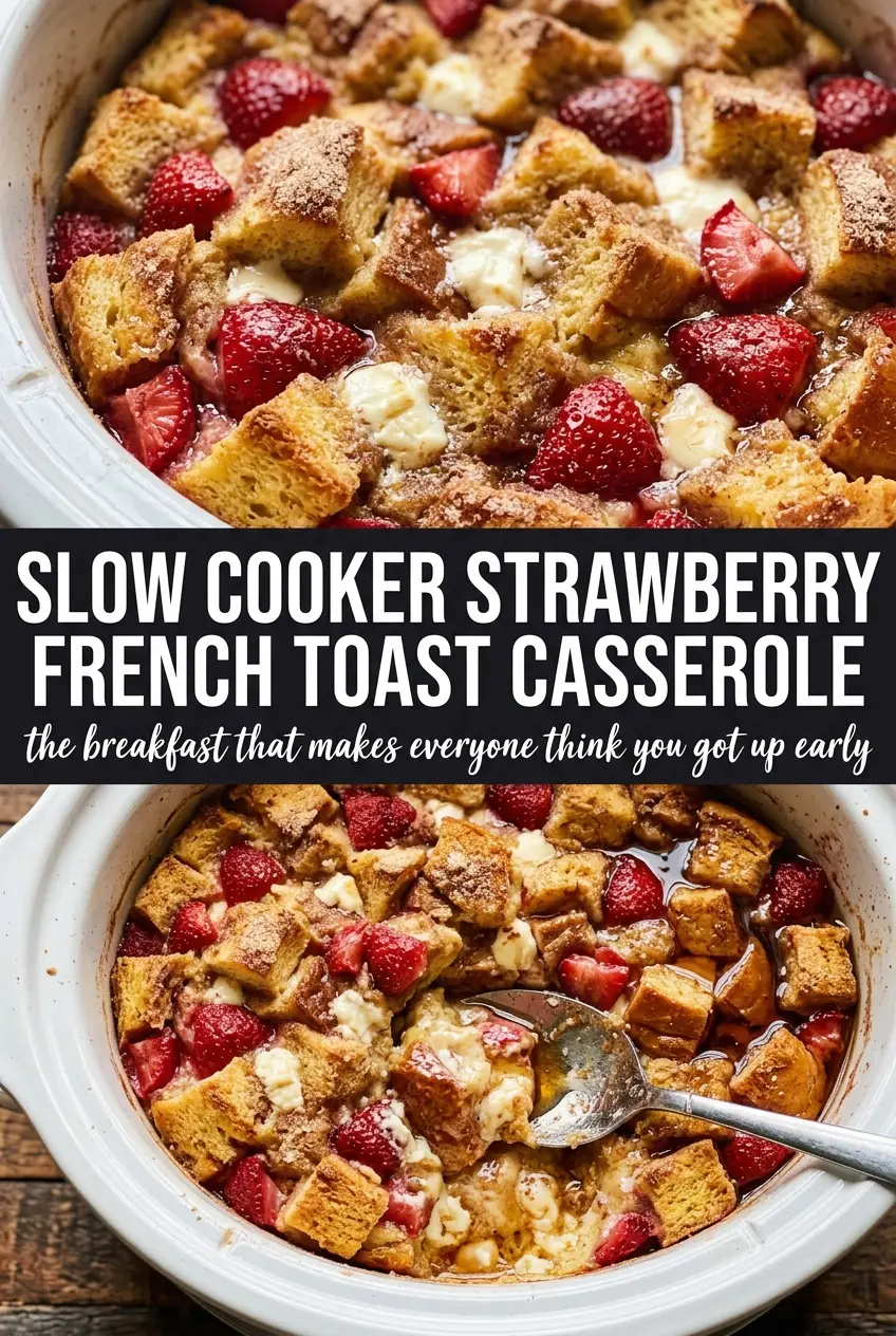 Save this slow cooker strawberry French toast casserole for a hands-off breakfast with creamy custard and bright berry pockets.