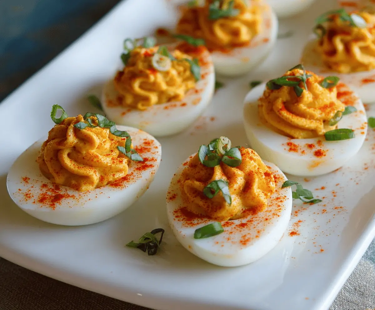 These Spicy Sriracha Deviled Eggs are a fun twist on a classic favorite! Smooth, creamy yolks mix with zesty Sriracha for a kick that spices up any gathering.