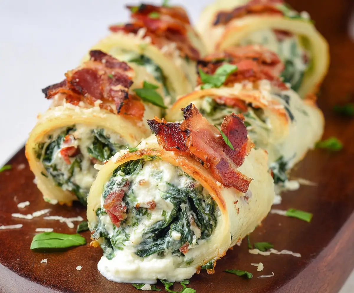 These Spinach and Bacon Cream Cheese Roll Ups are a tasty bite-sized snack. They bring together the fresh taste of spinach, crispy bacon, and creamy cheese in a delightful wrap!