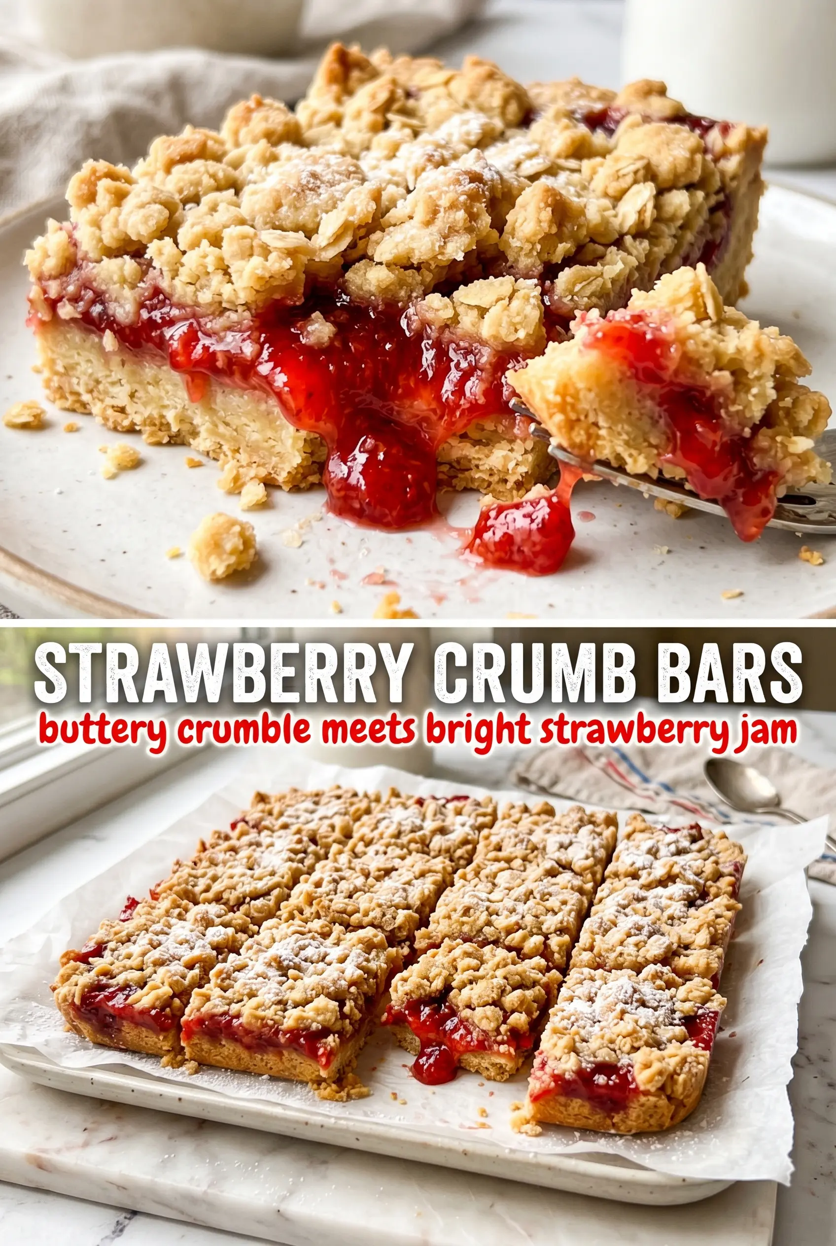 Golden strawberry crumb bars deliver the kind of soft, jammy center and buttery topping that disappears fast from a dessert table. The bottom bakes into a sturdy crust, the middle turns glossy and bright with fruit, and the crumble on top stays tender with just enough crunch to keep each bite interesting.