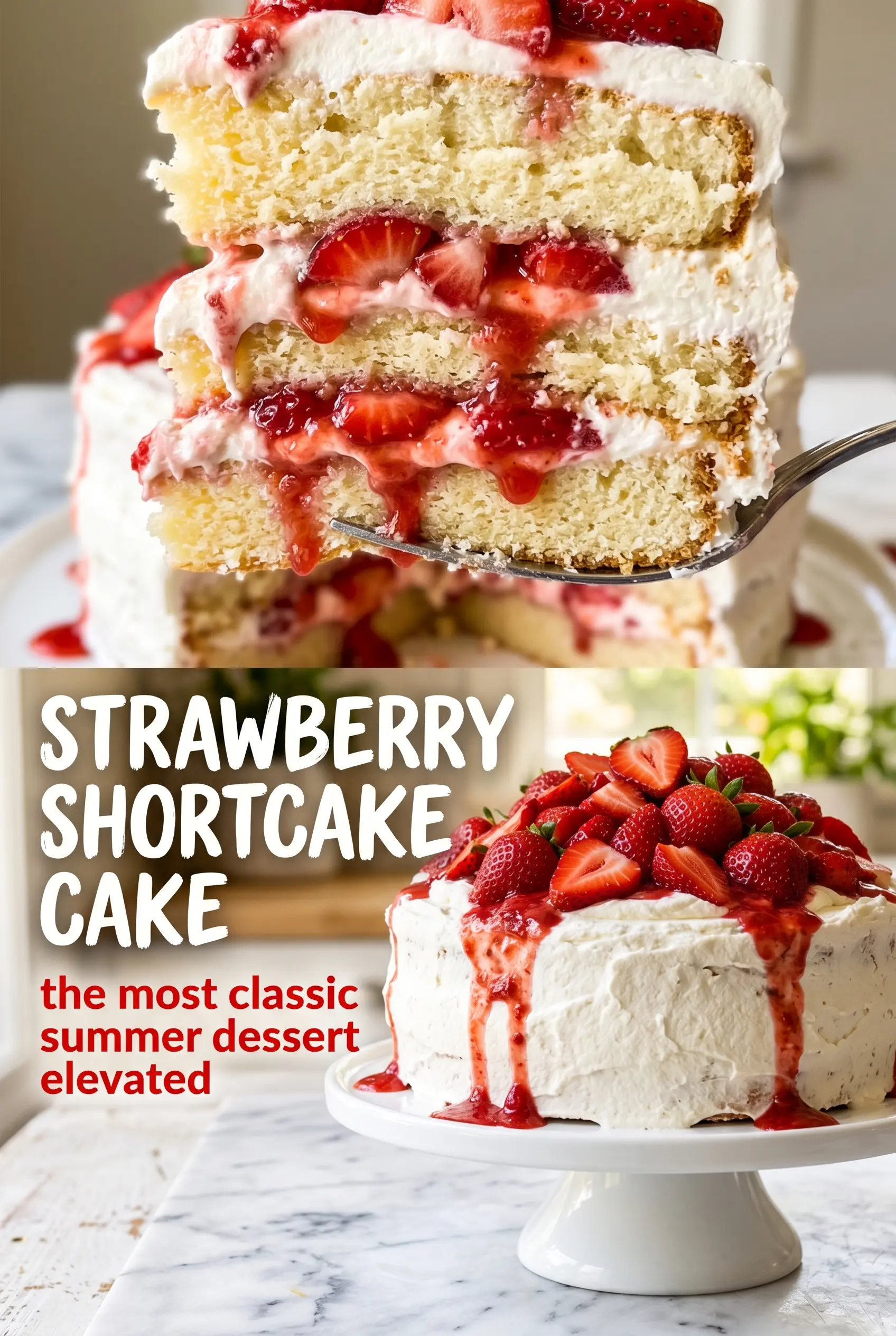 Save this strawberry shortcake cake for the first dessert that disappears at the table — soft vanilla layers, whipped cream, and juicy berries in every slice.
