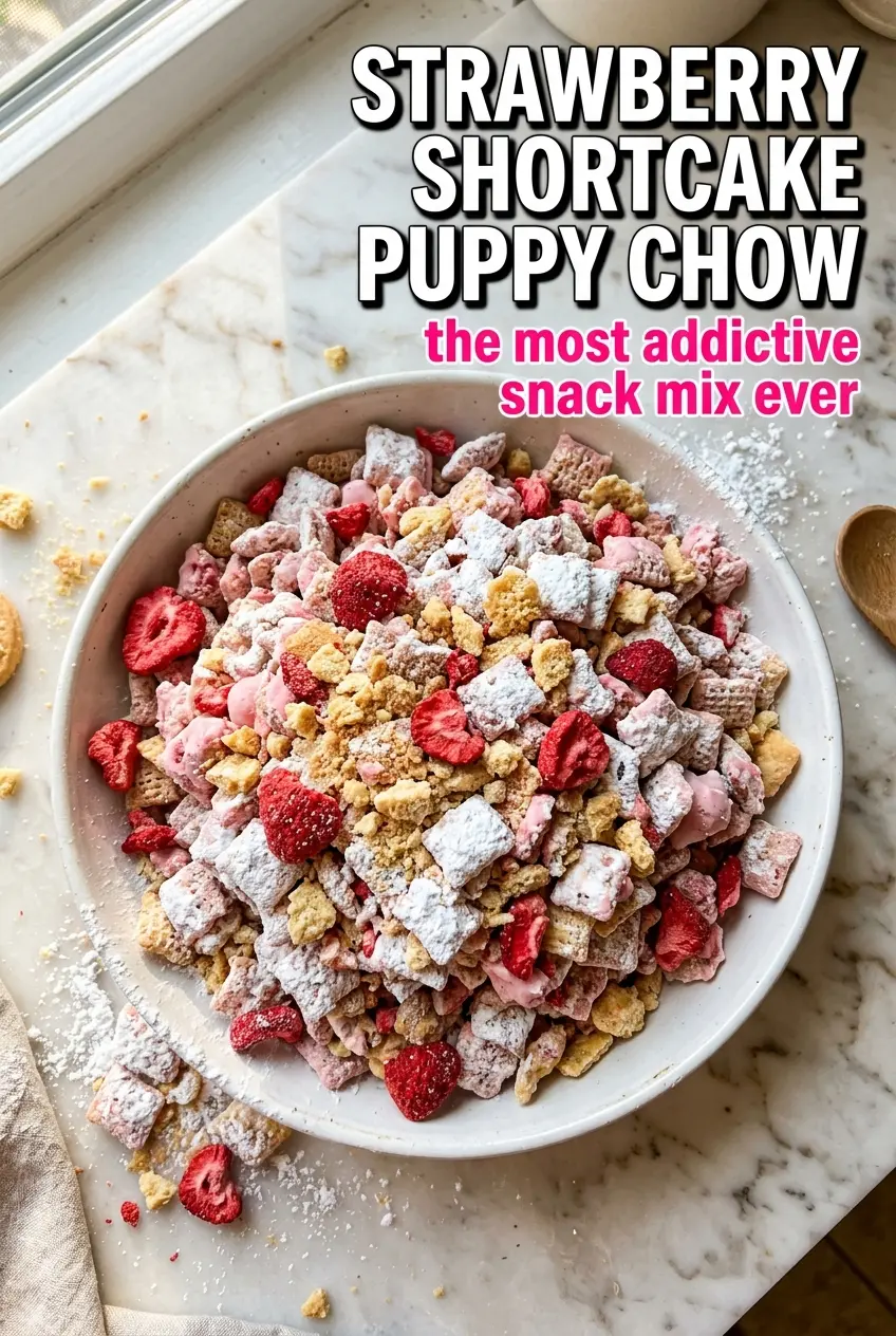 Strawberry shortcake puppy chow lands in that sweet spot between nostalgic snack mix and dessert. Every handful gives you crisp cereal under a soft powdery coating, plus little strawberry bursts that taste like the pink side of a birthday party. The white chocolate sets the whole thing into a sweet shell without making it heavy, and the vanilla cake mix powder adds that bakery-style note that makes people keep reaching back into the bowl.