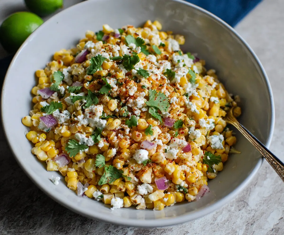 You can serve your street corn salad warm or chilled. Garnish with a fresh lime wedge on the side for that extra zesty touch. Enjoy this creamy, tangy, and slightly spicy delight as a side dish or snack!